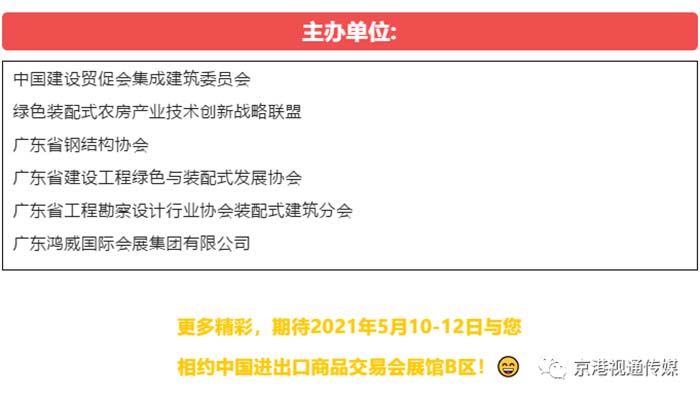 為了推進(jìn)裝配式建筑領(lǐng)域的廣泛合作,助力粵港澳大灣區(qū)建設(shè),由中國(guó)建設(shè)貿(mào)促會(huì)集成建筑委員會(huì)、綠色裝配式農(nóng)房產(chǎn)業(yè)技術(shù)創(chuàng)新戰(zhàn)略聯(lián)盟、廣東省鋼結(jié)構(gòu)協(xié)會(huì)、廣東省建設(shè)工程綠色與裝配式發(fā)展協(xié)會(huì)、廣東省工程勘察設(shè)計(jì)行業(yè)協(xié)會(huì)裝配式建筑分會(huì)、廣東鴻威國(guó)際會(huì)展集團(tuán)有限公司等聯(lián)合主辦的,將于5月10-12日在中國(guó)進(jìn)出口商品交易會(huì)展館B區(qū)11.1-10.1號(hào)館隆重舉辦,本屆吸引了近300家優(yōu)質(zhì)工程總承包供應(yīng)鏈企業(yè)展示先進(jìn)技術(shù)和產(chǎn)品,覆蓋裝配式建筑開(kāi)發(fā)建設(shè)、設(shè)計(jì)施工、集成房屋、部品部件、裝配式裝修、裝備制造等產(chǎn)業(yè)鏈上下游全領(lǐng)域。