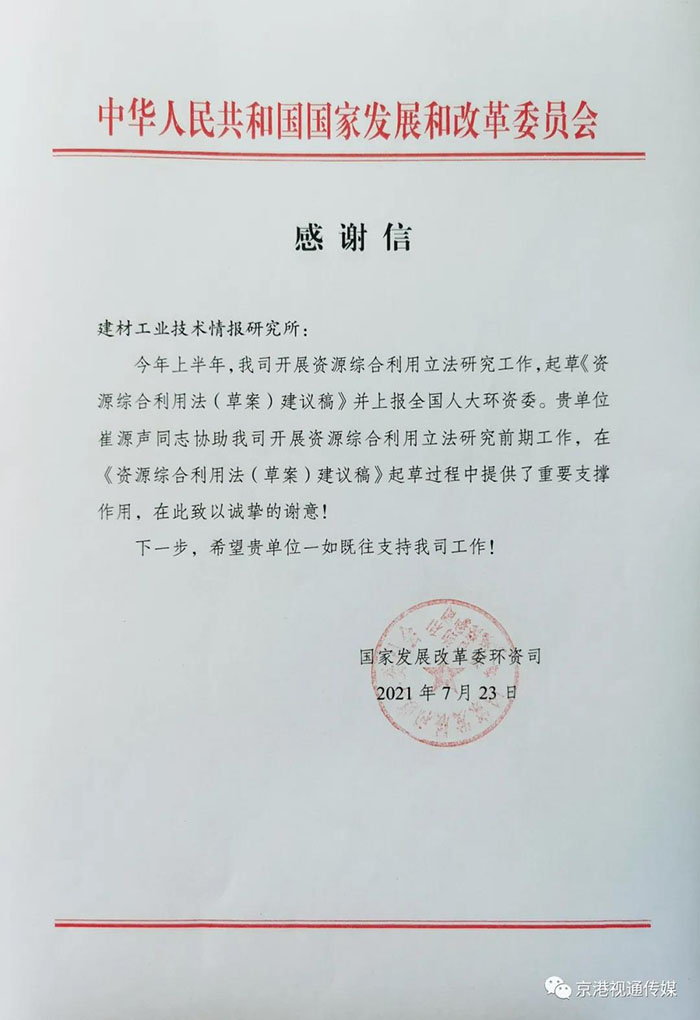 7月23日,國家發展改革委環資司發來一封感謝信,信中對建筑工業技術情報研究所首席專家兼中國綠建進出口產業聯盟主席崔源聲同志在《資源綜合利用法(草案)建議稿》起草過程中做出的努力給予肯定并表示感謝。詳細內容如下: